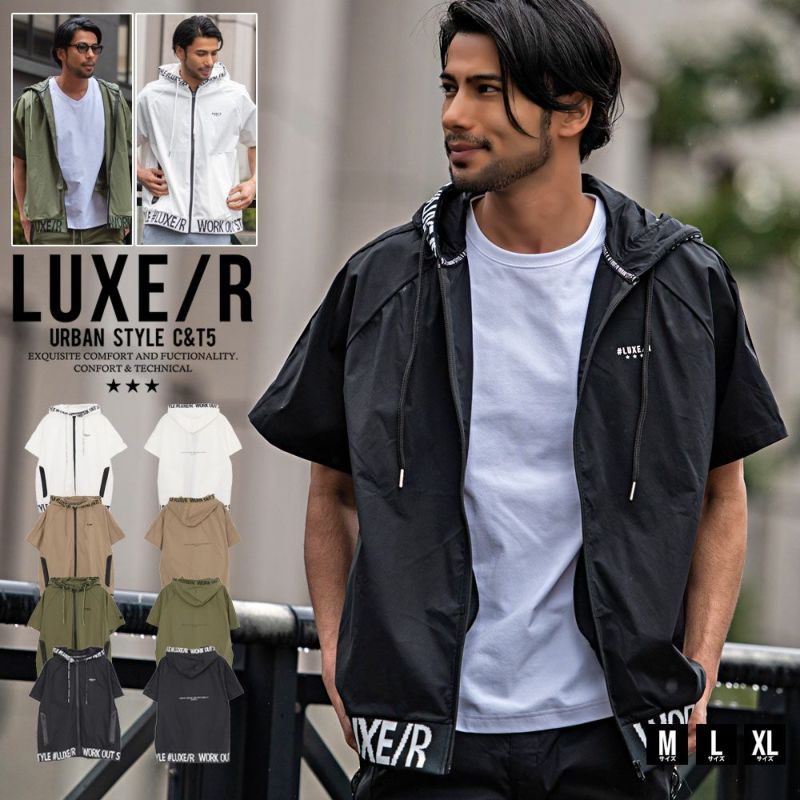 パーカー メンズ 半袖 ブランド おしゃれジップパーカー ロゴ ワンポイント ストレッチ 伸縮性 ゴルフ ジム ルームウェア 部屋着 ホワイト ベージュ カーキ ブラック 白 黒 M L XL LL 春 夏 秋 LUXE/R ラグジュ 大人 カジュアル 男性 男 父の日 父の日ギフト 父の日プレゼント 20代 30代 40代 ファッション メンズファッション 東京 プレゼント 誕生日 記念日 贈り物 ギフト