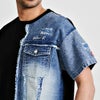アシンメトリにデニム生地を切り替えたプラップポケット付きデザインのクルーネックTシャツ。