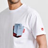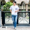 デニムとチェック柄の生地がポケットに施されたクルーネック半袖Tシャツ。