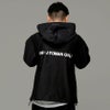 左肩にワンポイントとバックにロゴデザインをほどこしたインパクト抜群なスタンドジップパーカー。
