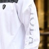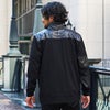 肩部分と右袖にPU切り替えを施し、左袖にはラインストーンでロゴを配置した印象的なデザイン。