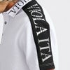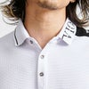 肩から左袖にかけて切り替えロゴをあしらったインパクト抜群の半袖ポロシャツ。