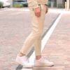 フェイクスウェード素材を使用した、上品さと快適さを兼ね備えたパンツ。