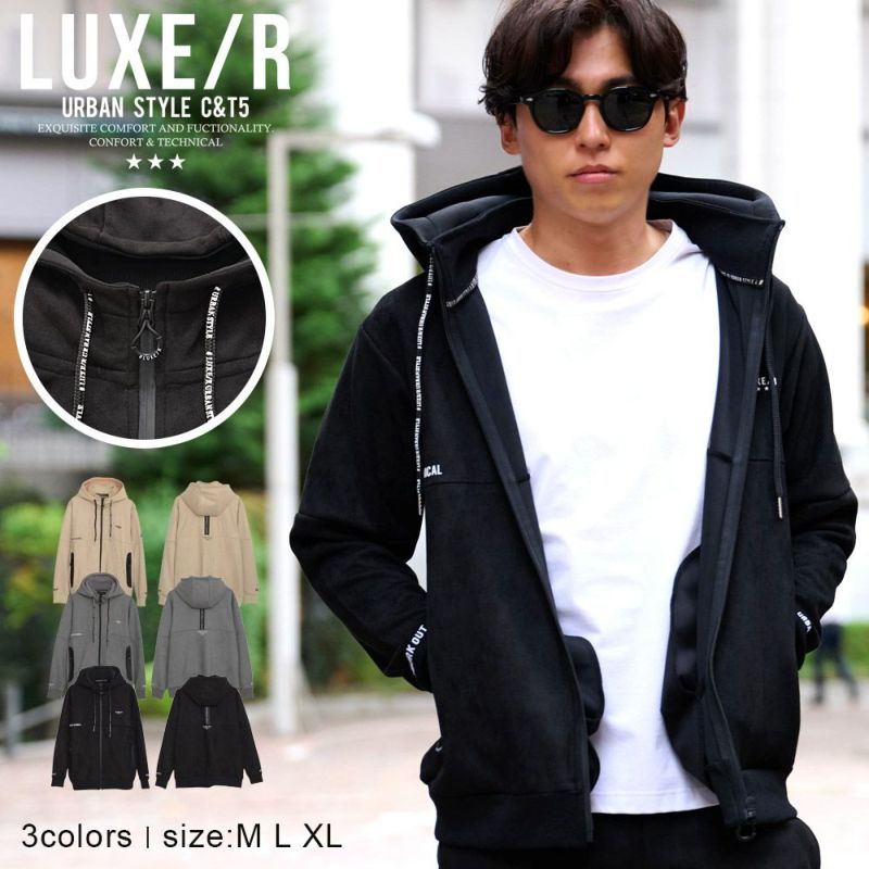 パーカー メンズ ジップパーカー ブランド トップス フェイクスウェード スエード 切替 ロゴ グレー ブラック 止水ジップ ポケット 黒 羽織 セットアップ可 LUXE/R ラグジュ 大人 M L XL 20代 30代 40代 50代 ちょいワル ユニセックス ラグジュアリー 男性 男 服 秋 冬 秋冬 ファッション 東京 プレゼント 誕生日 記念日 贈り物 ギフト