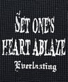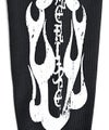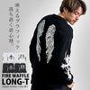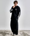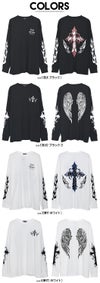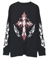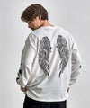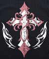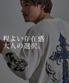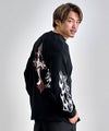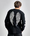 背面に大胆に配したクロスやウイングモチーフ、袖のフレイムやトライバル柄など、サブカルチャー要素を随所に落とし込んだ存在感のある一着。