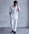同素材のシャツと合わせれば、統一感のある大人のセットアップスタイルが完成。