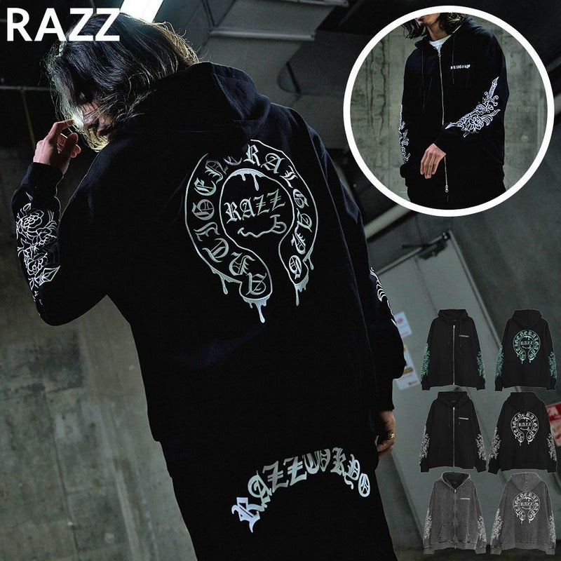 袖にはダガーと薔薇を組み合わせたRAZZISオリジナルモチーフをプリントで配置し、直線と曲線が交差するグラフィックがストリートらしいエッジをプラス。