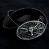 大きなバッファローバックルが特徴的で、しなやかなで厚みのある合成皮革を使用したデザインベルトです。