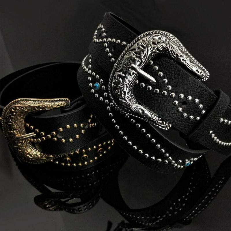最大の特徴は、ベルトの枠を超えた存在感を放つ大型の「彫金風バックル」。