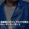 PUレザー生地を使った高級感ある印象を与えつつも、カジュアルな雰囲気も併せ持つデザインのダブルライダースジャケット。