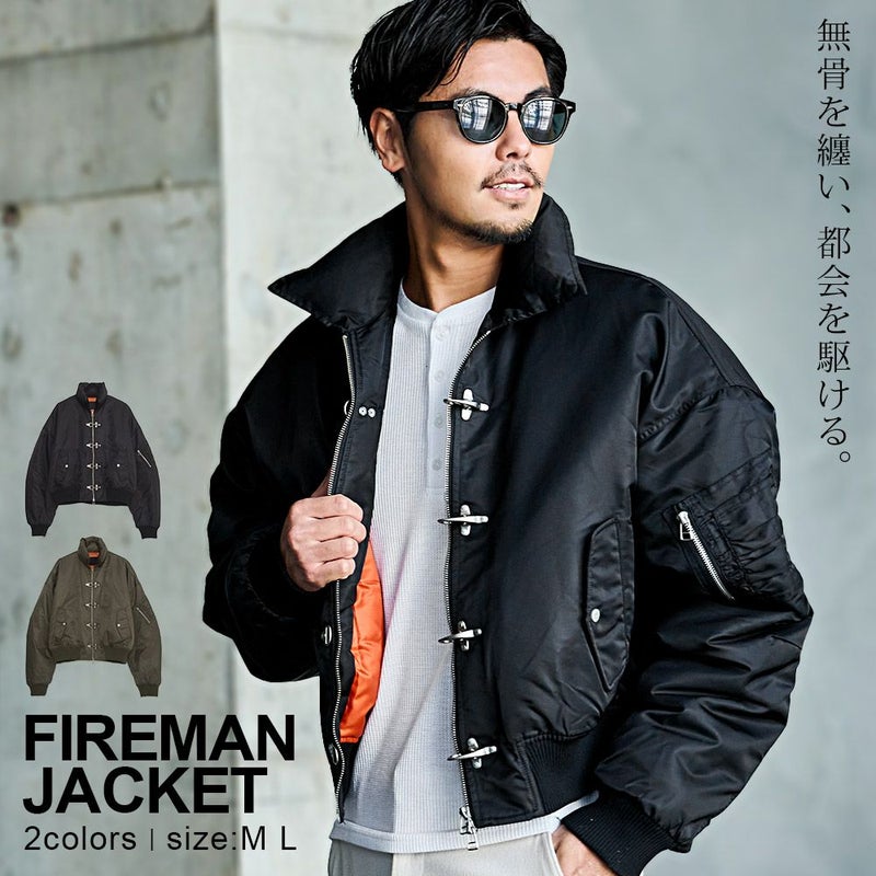 ボリュームのあるアームとショート丈のMA-1シルエットに、フロントのファイヤーマンフックがトレンドらしさを加速。