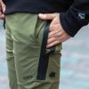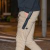 両サイドのポケットには止水ジップを採用し、左ももにはワンポイントのラバーワッペンを配置。