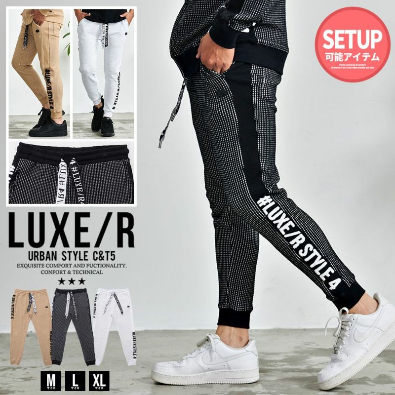 ジョガーパンツ メンズ セットアップ可 イージーパンツ スウェットパンツ ブランド おしゃれ ワッフル ストレッチ 伸縮性 ロゴ ジャガード 総柄 M L XL LL ホワイト ベージュ ブラック 白 黒 カジュアル ストリート 大人 上品 春 夏 秋 冬 秋冬 スポーツ ゴルフ ラグスポ ラグジュアリー ラグジュ LUXE/R 男性 父の日 父の日ギフト 父の日プレゼント 20代 30代 40代 メンズファッション 東京 プレゼント 誕生日 記念日 贈り物 ギフト