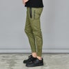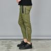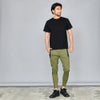 伸縮性のある布帛素材を使用したテーパードシルエットのイージーパンツ。