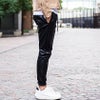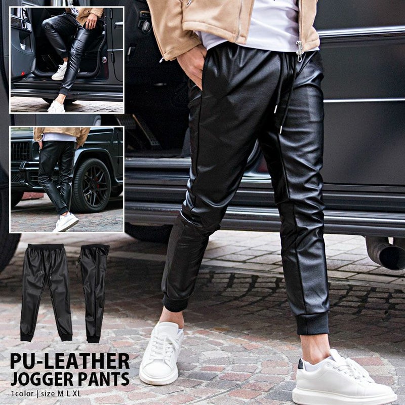 ※モデル画像は照明などの影響により実際の商品と異なる場合がございます。T.S【ジョガーパンツ メンズ レザーパンツ サイドライン 細身 スリム リブパンツ ラグジュアリースポーツ ブラック 黒 M L XL 合皮 革パン 2020 秋 冬】