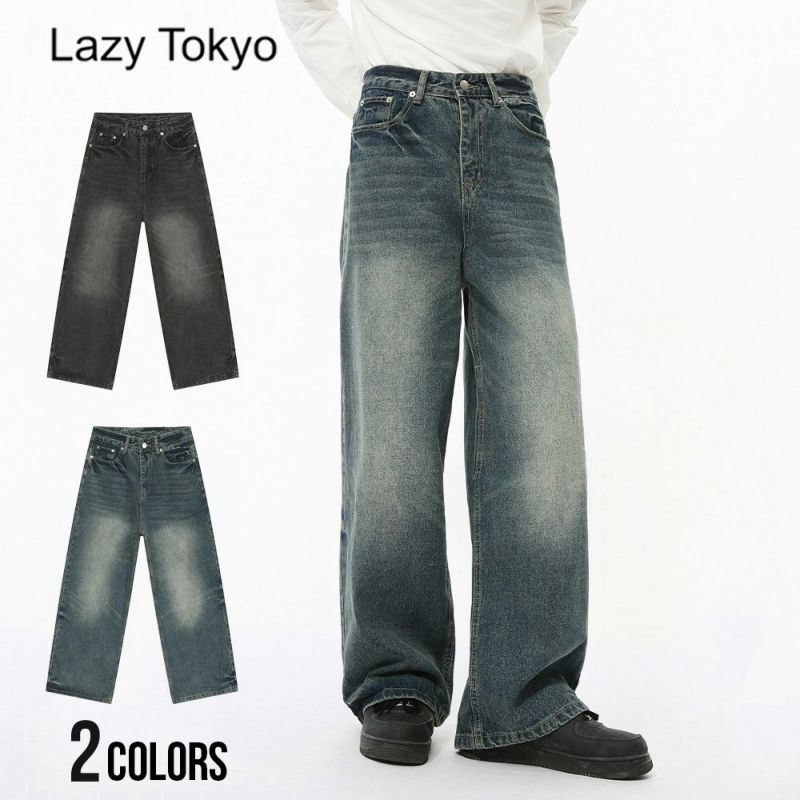 デニムパンツ メンズ ブランド おしゃれ ブランド ジーンズ ジーパン Gパン ワイドパンツ ワイドデニムパンツ ゆったり ブリーチ ストーンウォッシュ ダメージ プリーツ Lazy Tokyo レイジートウキョウ ブランド 色落ち ヴィンテージ ビンテージ ユーズド 古着風 ブルー 青