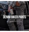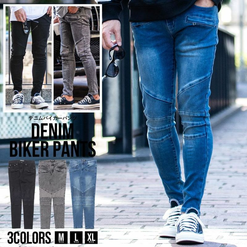 バイカーパンツの要素を取り入れ、タフなイメージとエッジの効いたデザインが特徴のスキニーデニム。
