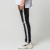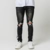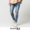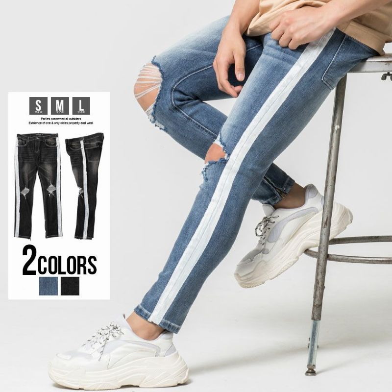 ※モデル画像は照明などの影響により実際の商品と異なる場合がございます。【デニムパンツ ダメージ ライン 裾ジップ メンズ ブルー ブラック ストレッチ スキニー ジーンズ ボトムス ストリート カジュアル シンプル 黒 S M L 春 夏 2020】