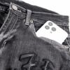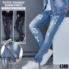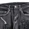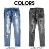 腿から裾にかけて散りばめたクロスモチーフや英語モチーフワッペンが特徴のデニムパンツです。