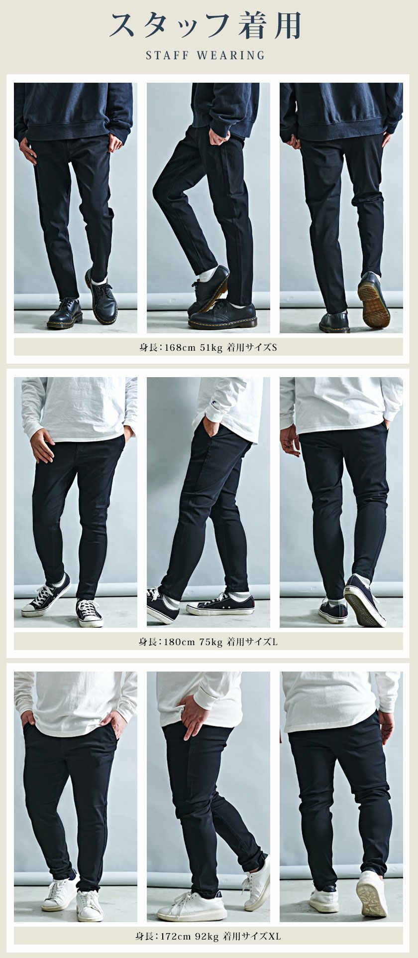 XL:着丈97股上29股下68ウエスト40ヒップ50わたり(もも幅)29膝幅19裾幅15