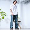 シンプルなTシャツと合わせて、デニムの存在感を際立たせたスタイルに。