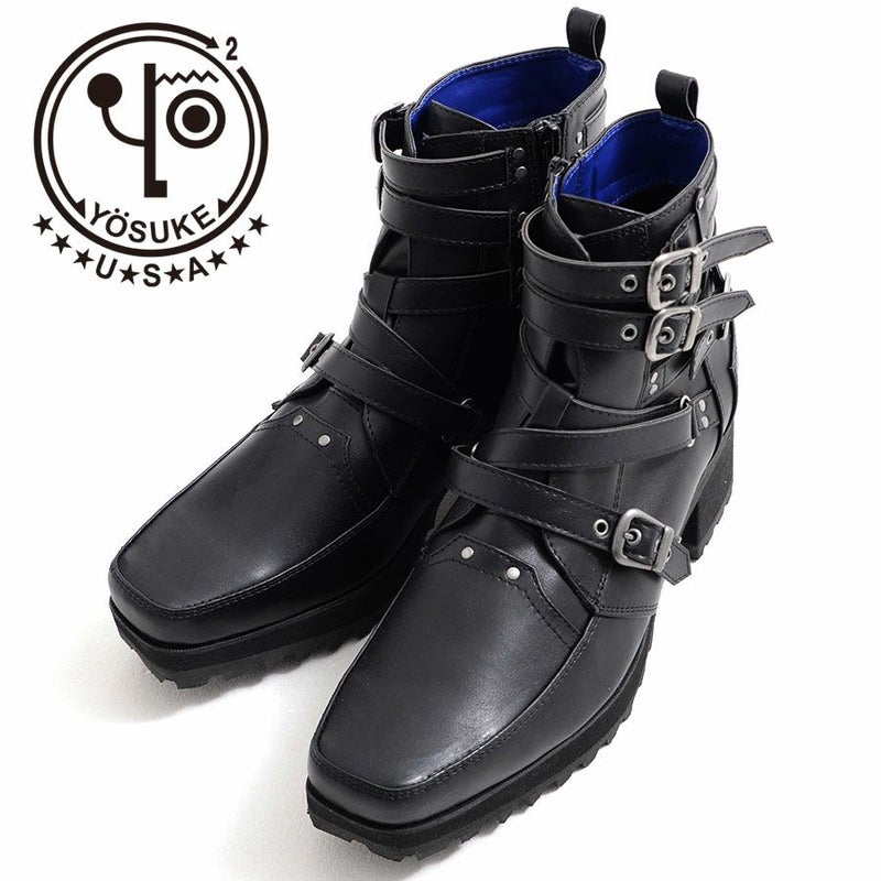 【商品説明】YOSUKE【ヨースケ】の厚底ベルテッドブーツが登場しました。スタッズと多重ベルトデザインのロックテイストなアイテムです。 ロングノーズが人気のショートブーツは約6センチの厚底ヒールとシャープなデザインでスタイルアップが叶うシルエットになっています。内側にはジップが採用され着脱も簡単なのが嬉しいポイント。V系~地雷系までトレンドスタイルに幅広くコーデに合わせられるオススメブーツです。