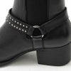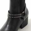 ロングノーズのシャープなフォルムに、スタッズをあしらったリングベルトがクールな存在感のあるハイヒールブーツ。
