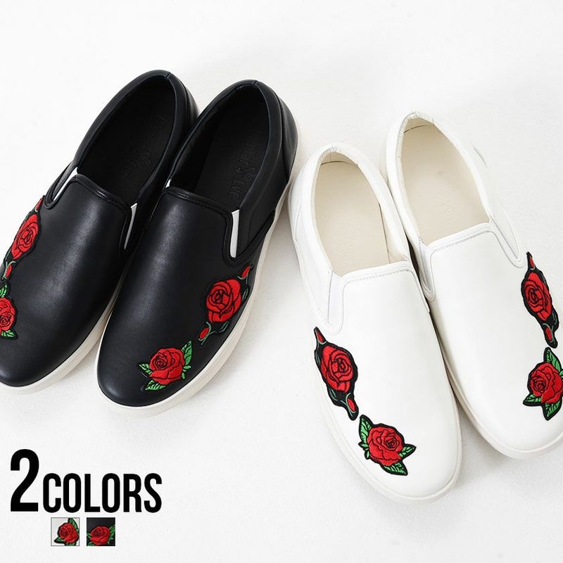 【スニーカー 靴 くつ シューズ 薔薇 合皮 スリップオン カジュアル】