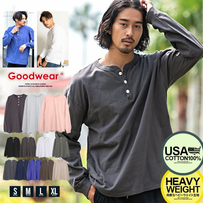 長袖Tシャツ メンズ ロンT Goodwear グッドウェア トップス USAコットン ヘンリーネック カジュアル ヘビーオンス ヘビーウェイト 厚手 7オンス トップス インナー 無地 定番 アメカジ ストリート ストリート系 ストリートファッション 韓国 韓国系 韓国ファッション 下北沢 下北系 古着 古着系 90s 90年代 男性 男 父の日 父の日ギフト 父の日プレゼント 20代 30代 40代 メンズファッション 東京 プレゼント 誕生日 記念日 贈り物 ギフト