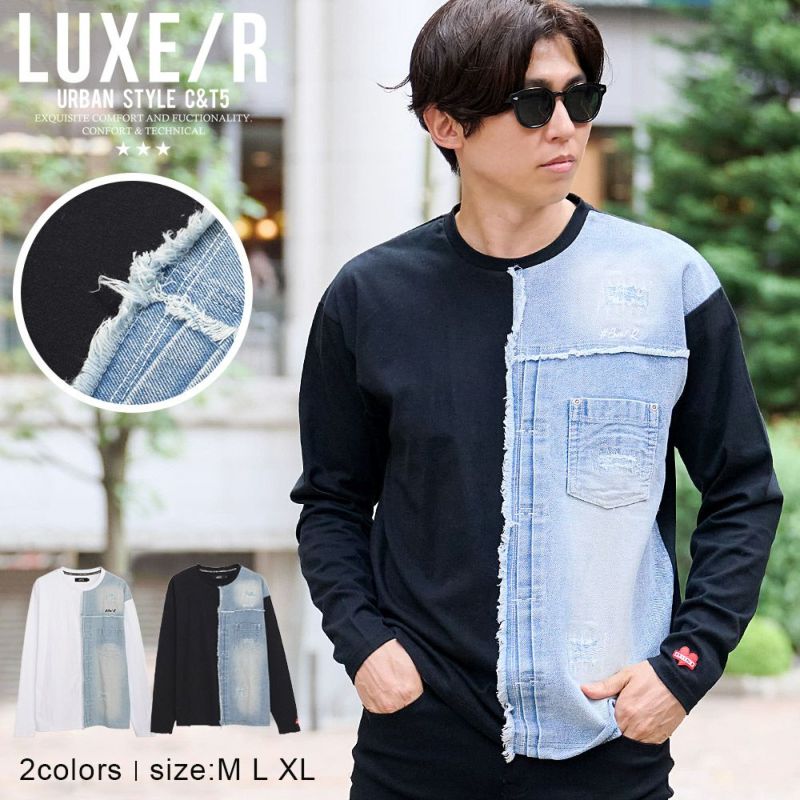 ロンT メンズ 長袖 長袖Tシャツ ブランド おしゃれ 大きいサイズ トップス カットソー インナー クルーネック デニム 切替 切り替え ポケット付き ポケT ロゴ 刺繍 ワンポイント ダメージ加工 クラッシュ ヴィンテージ ビンテージ 古着風 綿100% コットン 細身 スリム タイト ゆったり ストレッチ 伸縮性 ゴルフ ゴルフウェア ゴルフウエア ホワイト ブラック 白 黒 M L LL XL LUXE/R ラグジュ 大人 スポーツ カジュアル ストリート ストリート系 韓国 韓国系 韓国ファッション 下北沢 下北系 古着 古着系 90s 90年代 2000年代 Y2K ユニセックス レディース 男女兼用 ペア カップル 服 秋 冬 秋服 冬服 男性 男 父の日 父の日ギフト 父の日プレゼント 20代 30代 40代 ファッション メンズファッション 東京 プレゼント 誕生日 記念日 贈り物 ギフト