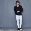 程よく開いたVネックはすっきりとした色気のある首元に魅せてくれます。