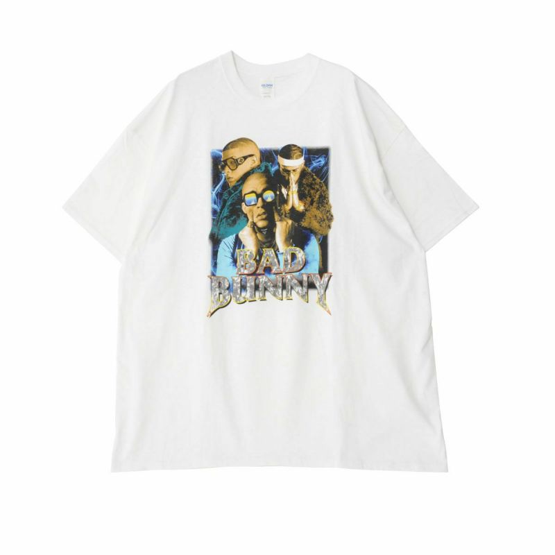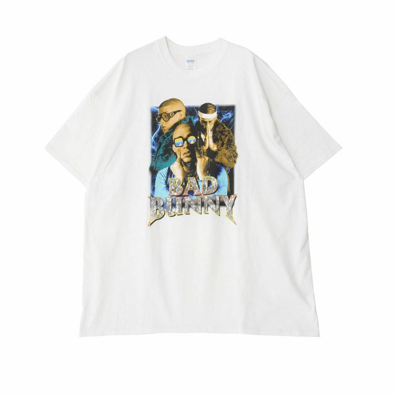 人気ラッパーのBad BunnyをプリントしたインパクトのあるTシャツ。