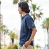 左袖にロゴワッペンが付いた、トレンドのヘンリーネック半袖Tシャツ。