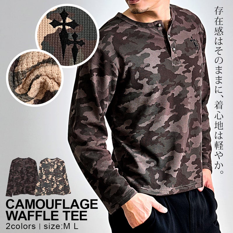 ワッフル生地を採用した、存在感のある迷彩柄長袖Tシャツ。