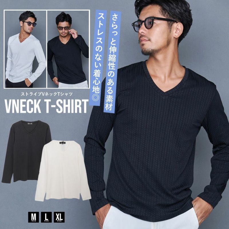Tシャツ メンズ ブランド おしゃれ 長袖 長袖Tシャツ ロンT ストライプ ヘリンボーン トップス カットソー Vネック 伸縮 M L XL 白T 白Tシャツ ホワイト ブラック 黒 ユニセックス CavariA 大人 男性 男 服 春 夏 秋 冬 メンズファッション 20代 30代 40代 父の日 東京 プレゼント 誕生日 記念日 贈り物 ギフト