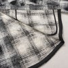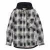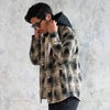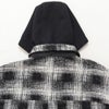クラシックなチェック柄に黒のフードをレイヤードしたようなデザインをプラス。