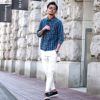 デニムのような風合いのインディゴ染めを施したチェックシャツ。