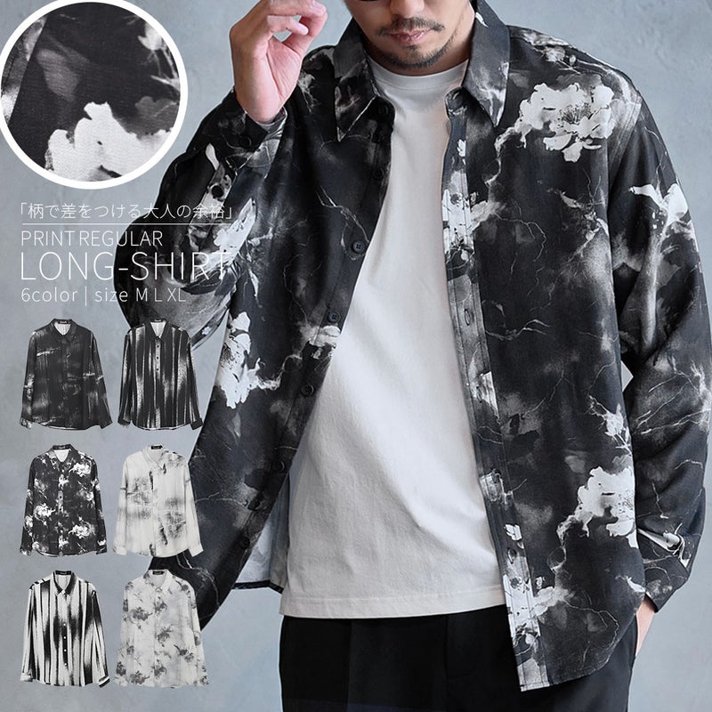 モノトーンで構成された洗練プリントが印象的なレギュラーシャツ。