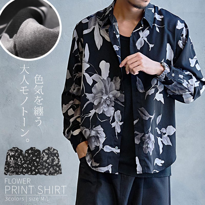 落ち着いたブラックベースに大胆なフラワープリントを施した総柄シャツ。