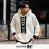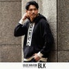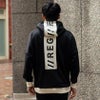バックからフードにかけてと、フロント部分に大きなロゴプリントを施したインパクト抜群の長袖パーカー。