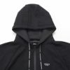 フード、袖、裾にはロゴ入りのジャガード織が施され、シンプルながらも存在感を放ちます。