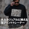 トレンドをおさえたシルバーの箔プリントが目を引くスウェットトレーナー。