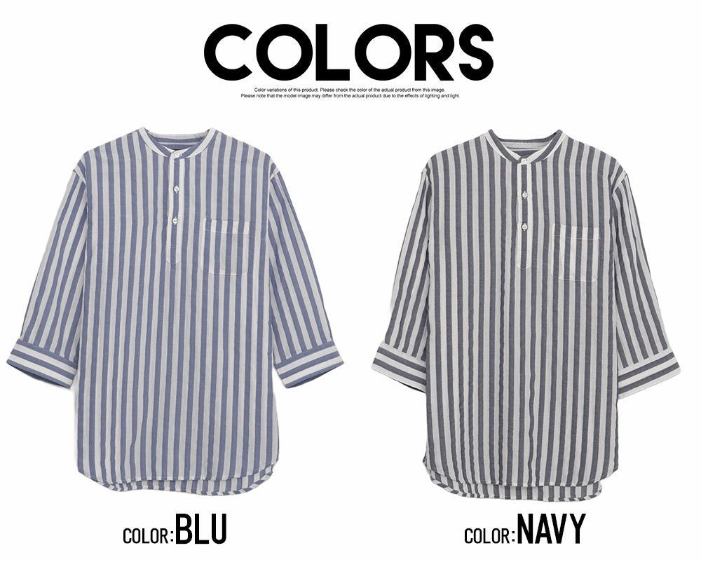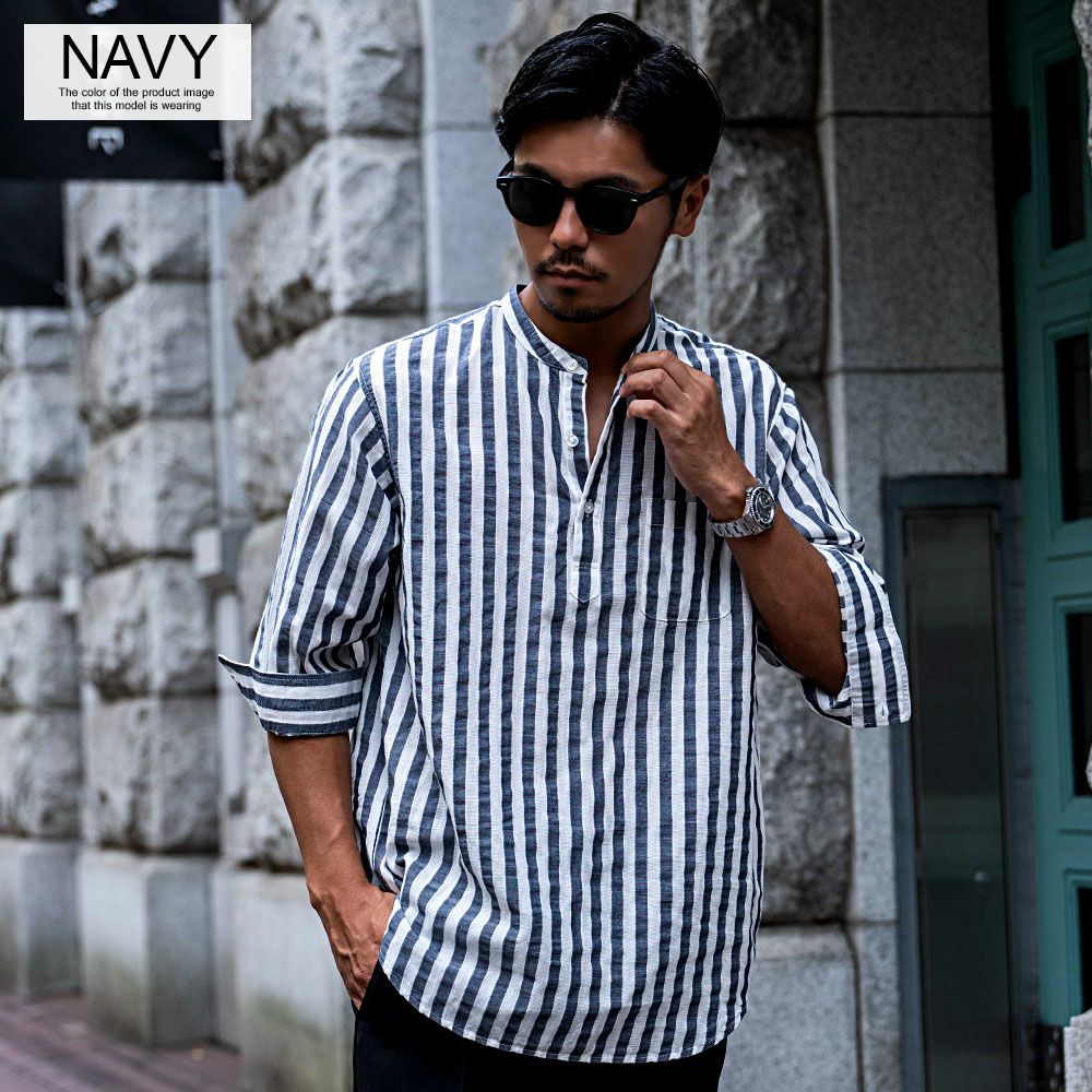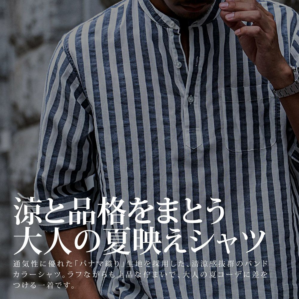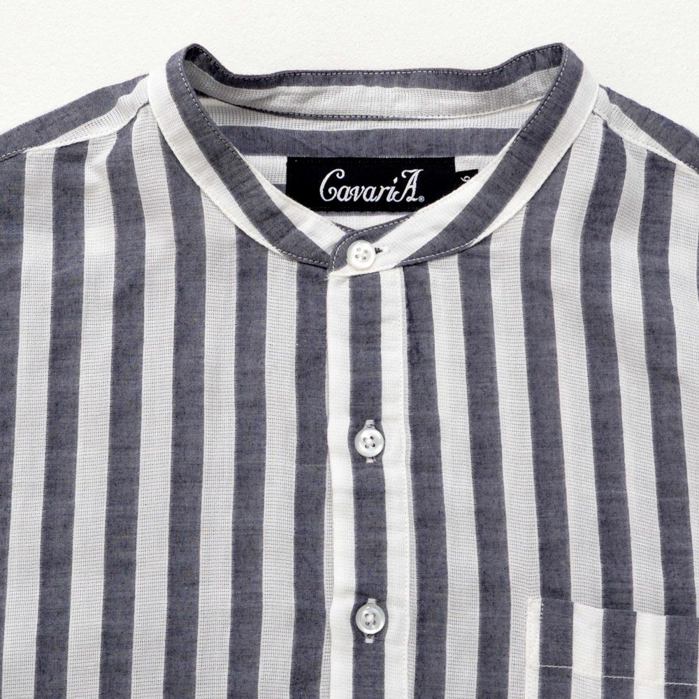 CavariA【キャバリア】パナマ織ストライプバンドカラープルオーバー7分袖シャツ/全2色