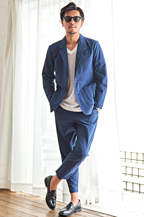 【code-335】清涼感溢れるシアサッカーカジュアルスーツセットアップ/ネイビー